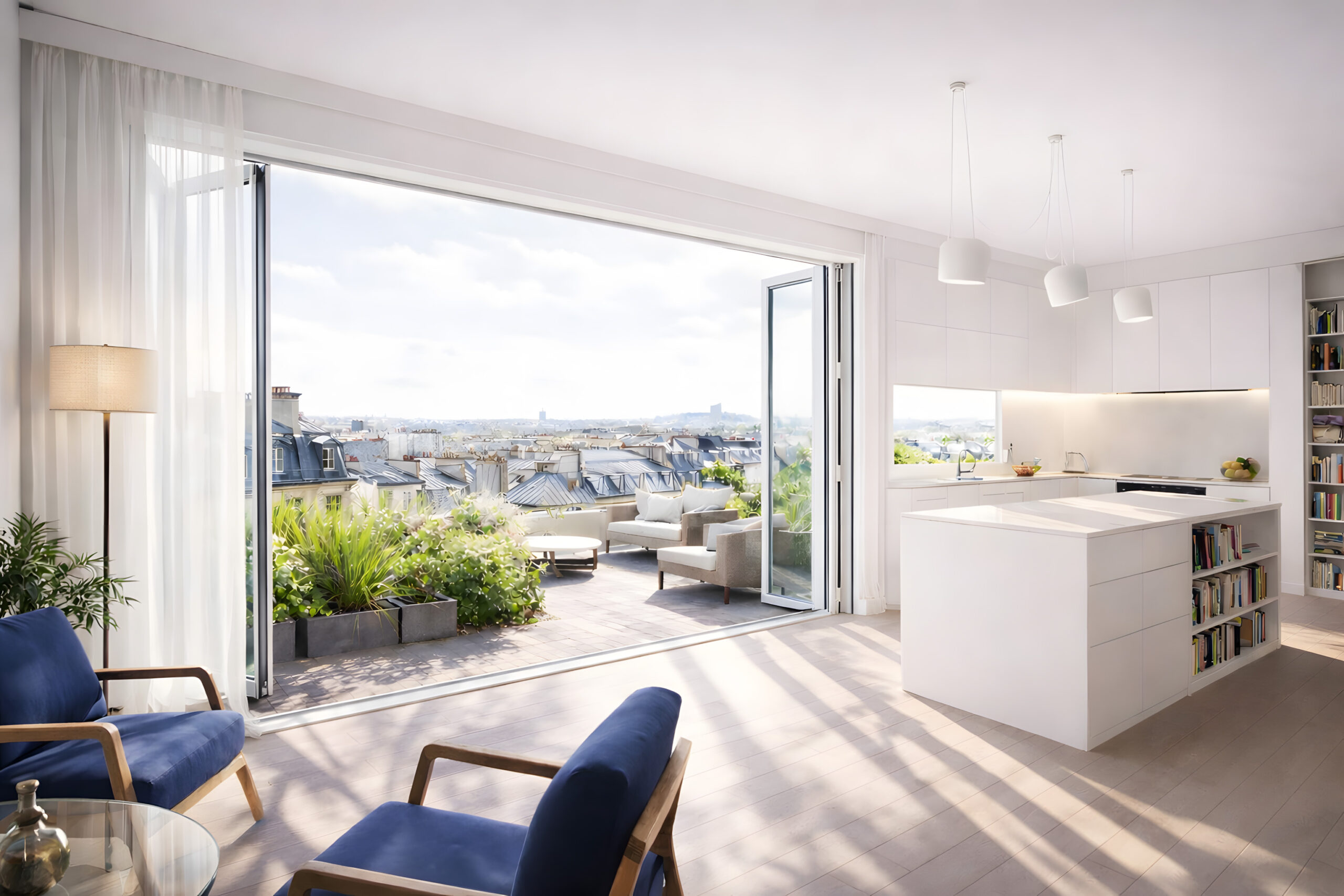 L’appartement est situé au 5° étage d’un immeuble récent. il offre une vue panoramique sur les toits de Paris. L’organisation en plan vise à désenclaver les espaces pour offrir des vues diagonales et libérer les déambulations.