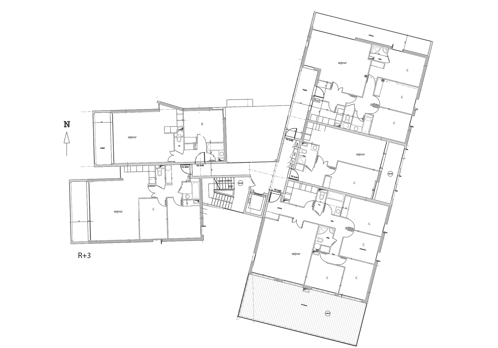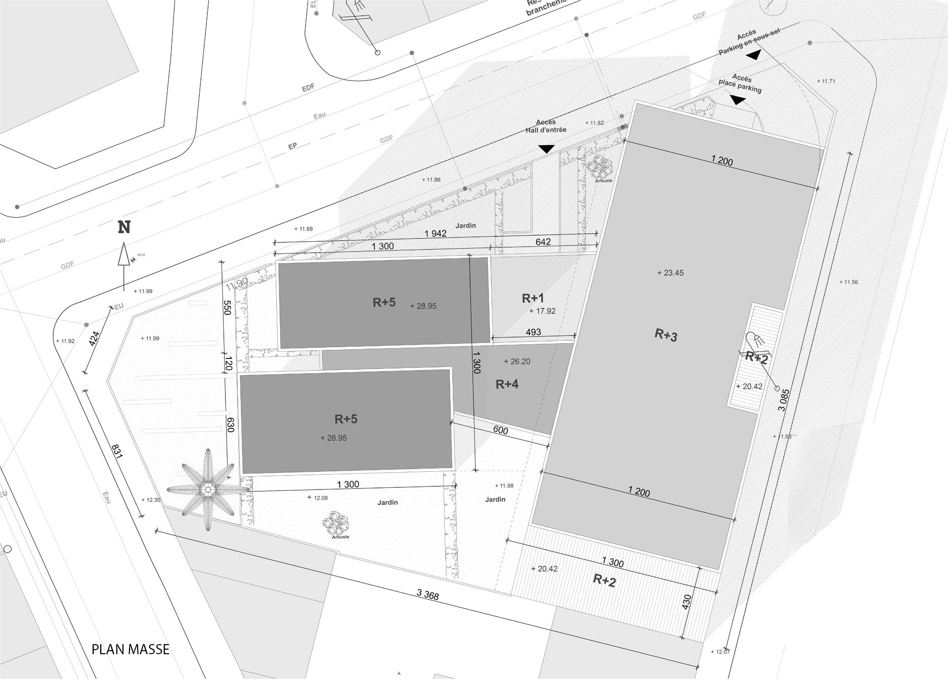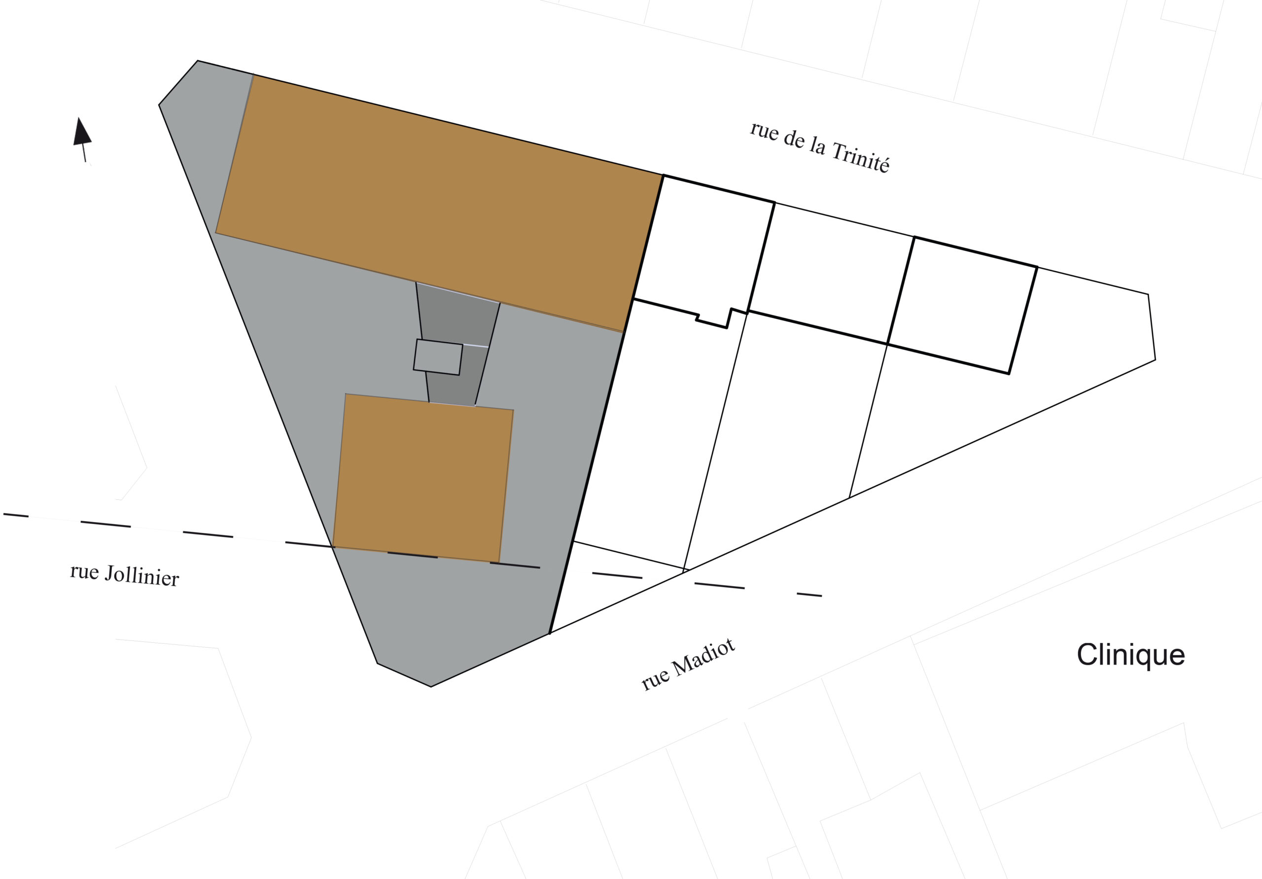 La composition des masses sur la parcelle est de type « ouverte ». Un premier bâtiment en R+3 vient reprendre l’alignement et les gabarits de la rue de la Trinité. Le deuxième bâtiment est disposé de façon à satisfaire aux prospects urbains et à dégager une perspective depuis la rue Jollinier. Sa hauteur, équivalente à R+5, vient « s’opposer » au gabarit imposant de l’équipement hospitalier. Il agit comme un contrepoint, capable de structurer les espaces résidentiels et publics. Entre les deux constructions s’intercale tout le dispositif de distribution verticale des étages. Les logements sont en quasi-totalité traversants. En raison des fortes probabilités de trouver le rocher et de l’eau à de faibles profondeurs, un seul niveau de stationnement, d’une capacité d’environ 30 places, est prévu.