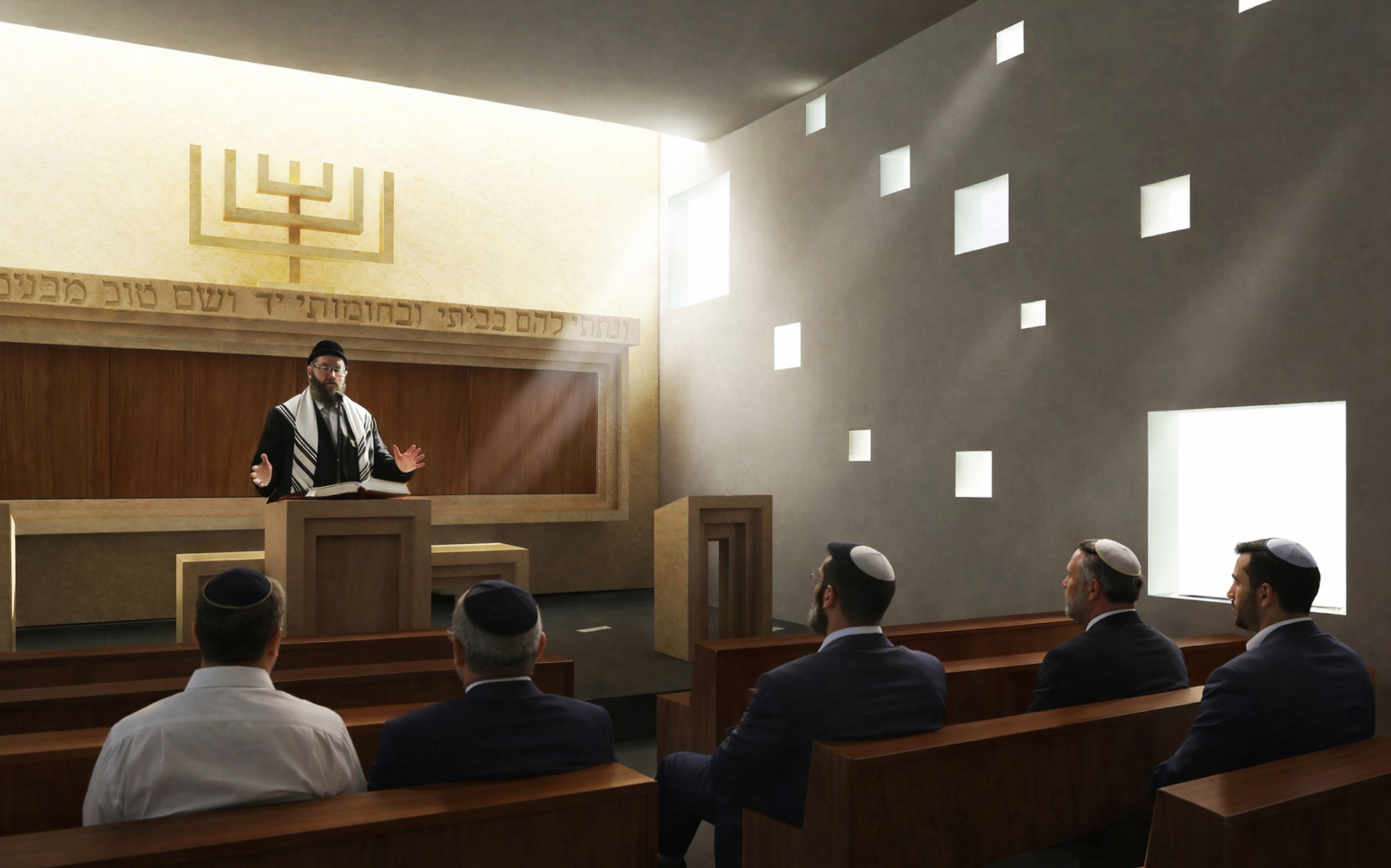 Le bâtiment est conçu pour offrir un cadre propice à l’étude et à la prière, tout en refusant les clichés formels de l’édifice religieux. L’esthétique résolument contemporaine donne la part belle à la salle de prière, volume double hauteur moucheté de percements aléatoires qui filtrent la lumière en préservant l’intimité du culte. Les prières sont tournées vers un autel inondé de lumière par une faille zénithale, en direction de Jérusalem. Les grands effets architecturaux sont laissés de coté, au profit du bien être, du confort, de la sérénité propices à la spiritualité.