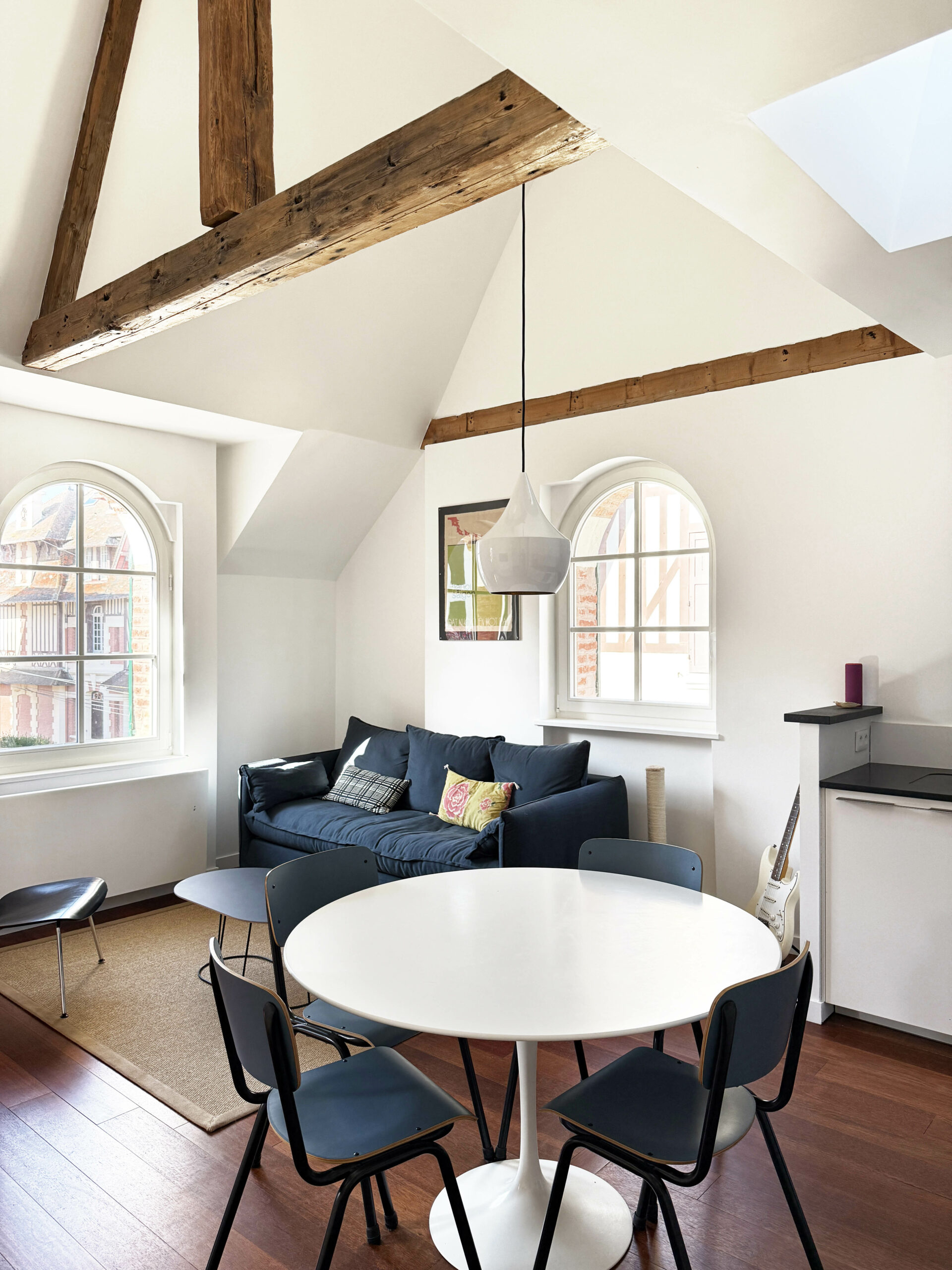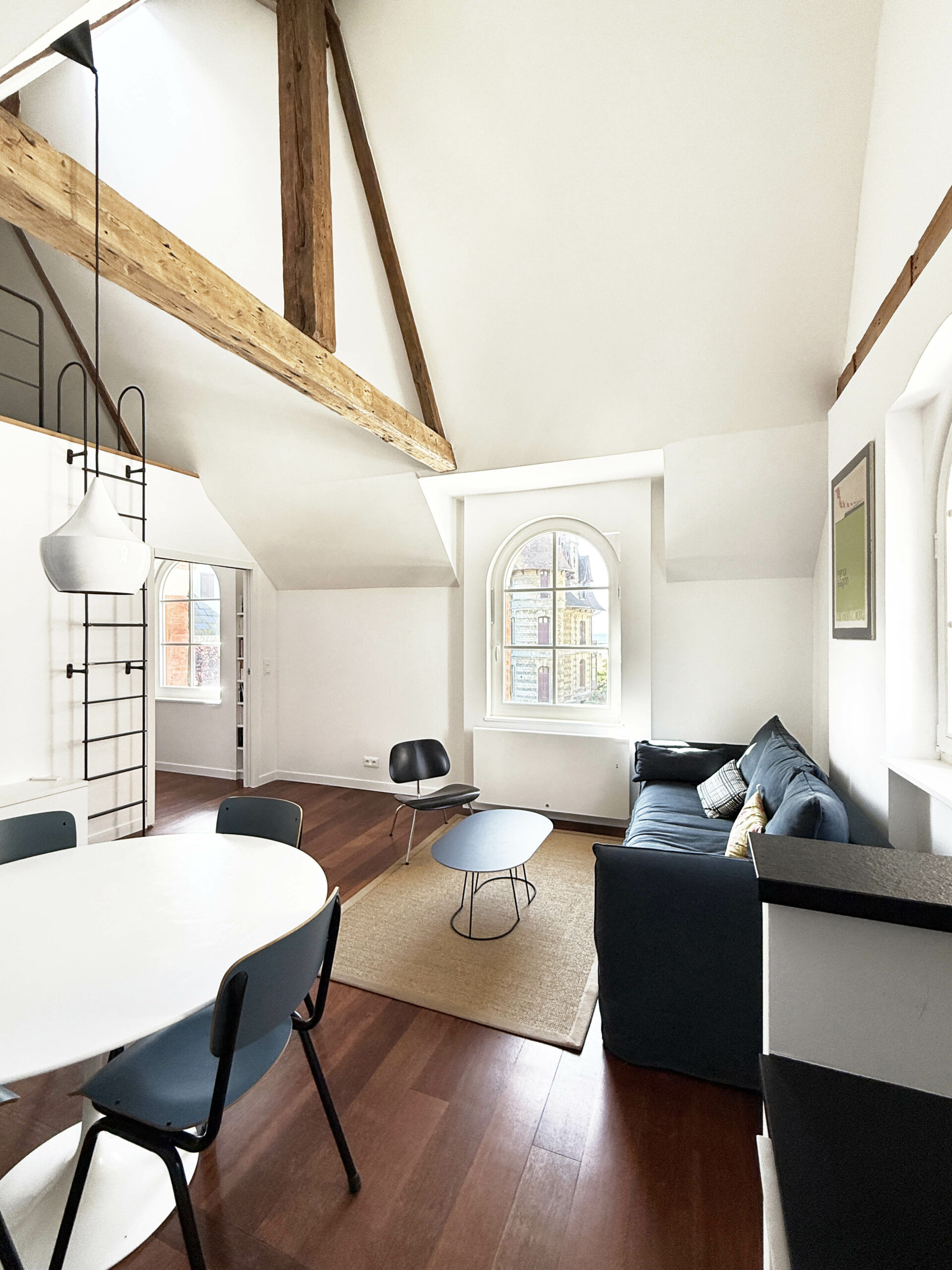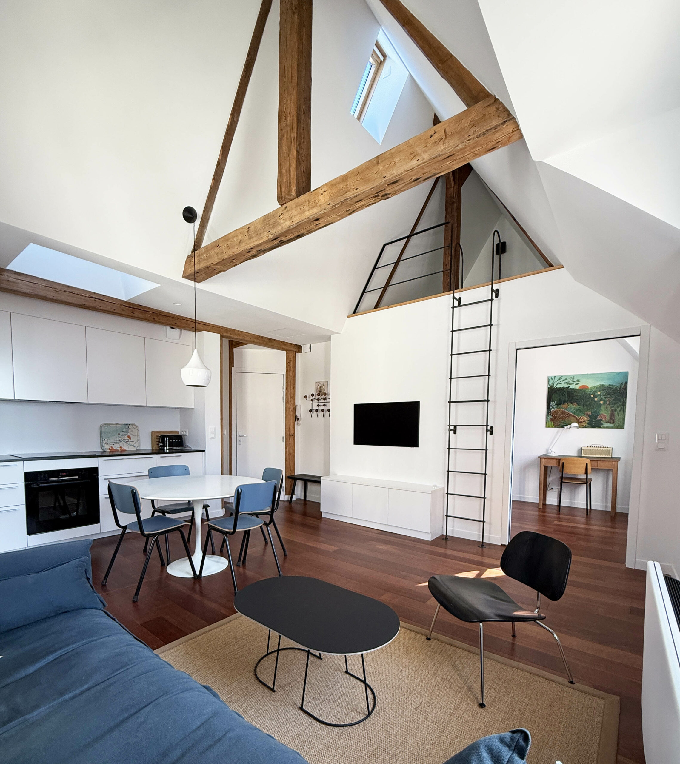 L’appartement sous les combles à été  réaménagé . La partie  comble  à été ouverte sur le séjour et la distribution à été revue. Les fenêtres, on été remplacées et  une attention particulière à été portée sur  l’isolation ainsi que la ventilation pour réduire les consomations energétiques en hiver et pour garantir le confort d’été.